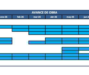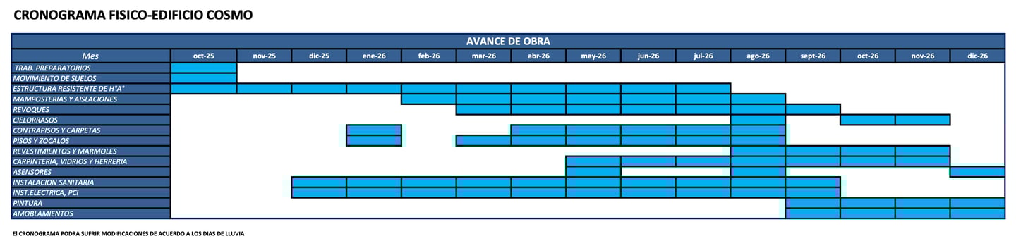 Seguimos construyendo con planificación y transparencia. En esta sección podés ver el cronograma de avance de obra del Edificio Cosmo, con las etapas proyectadas mes a mes y el progreso estimado hasta la finalización del proyecto.